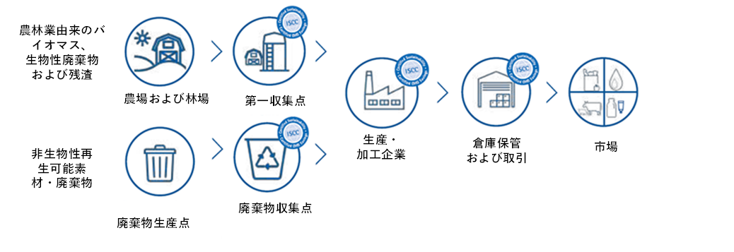 ISCC認証は、サプライチェーンの全段階(上流から下流まで)に適用されるシステムです。バイオマスおよび非バイオマス原材料生産者から、製品が最終市場に投入されるまでのあらゆる段階で、サプライチェーンの完全性と追跡可能性を確保するためにISCC認証が必要となります。