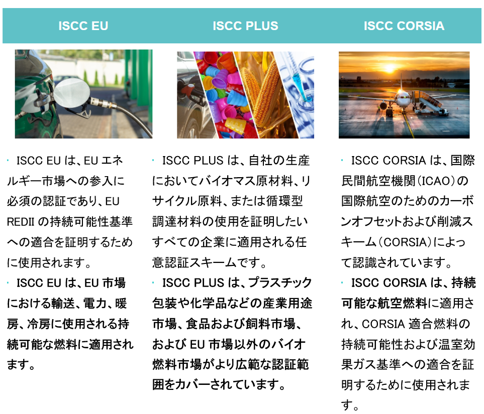 • ISCCは、欧州委員会(EC)によって、RED IIの持続可能性および温室効果ガス排出削減基準への適合を証明するために認められています。