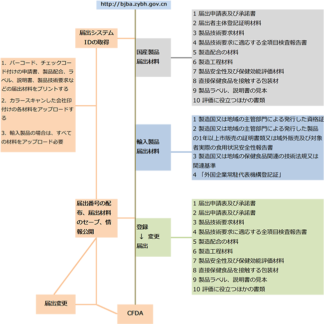 「中華人民共和国食品安全法(2015版)」によりますと、健康食品を中国市場に輸出しようとする企業は健康食品登録認可書又は届出認可書を申請して取得しなければなりません。中国国産健康食品の登録申請は中国国家市場監督管理総局(SAMR、元CFDA)に提出し、届出申請は省レベルの市場監督管理局に提出します。中国域外製造の輸入健康食品の場合、登録申請も届出申請も中国国家市場監督管理総局に提出します。その同時、中国域外企業は中国国内拠点或は中国国内の申請代行機構に登録及び届出の事項を委託しなければなりません。