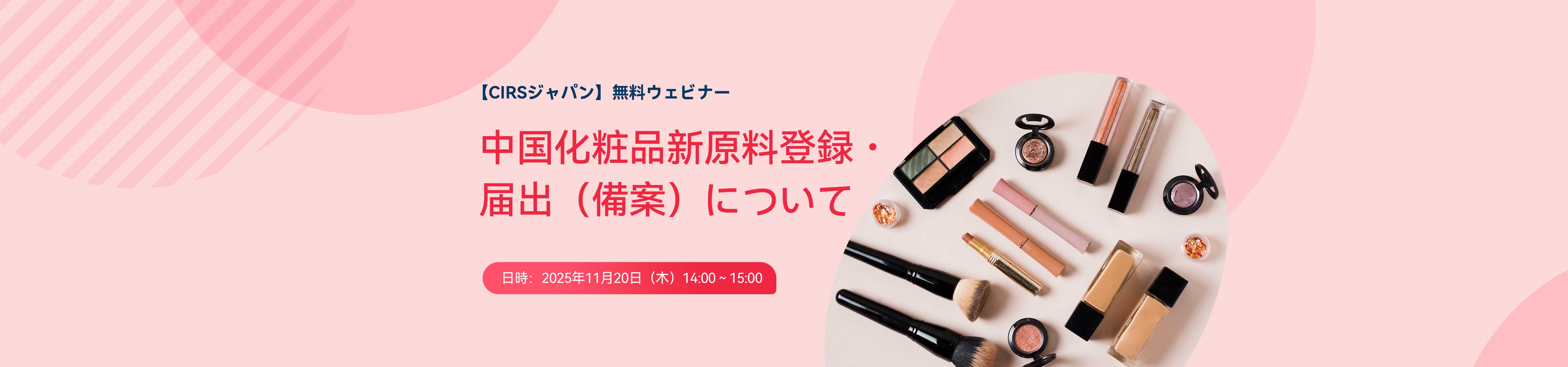 2025年11月20日(木)14:00~15:00、中国化粧品新原料登録・届出(備案)に関する無料WEBセミナーを開催いたします。本セミナーでは、中国における化粧品新原料の登録・届出(備案)制度について、最新の登録・届出状況および手続き要件をわかりやすく解説いたします。中国市場への化粧品新原料上市、または既存新原料の事後管理にご関心のある方は、ぜひご参加ください。