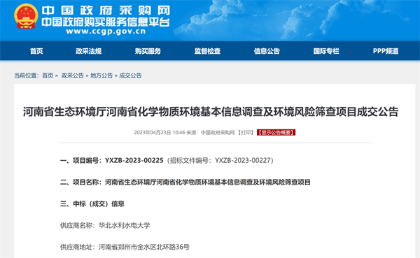 2023年4月23日、中国政府購買ネットの公告により、河南省生態環境庁は、「河南省化学物質環境基本情報調査および環境リスクスクリーニング評価」プロジェクトを華北水利水電大学に依頼しました。2023年末までのこのプロジェクトは、主に化学物質の環境基本情報の調査、「河南省優先制御化学物質名録」の作成、そして中国の優先制御新規汚染物質の生産・加工・使用、環境排出量と排出経路、危険特性などの環境リスクスクリーニングの詳細情報をさらに調査し、報告書を作成することになります。
