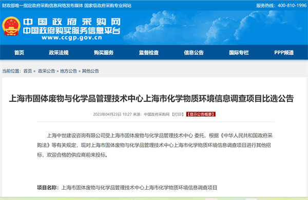 また、上海市固体廃棄物及び化学物質管理技術センターも、30万元の予算で2023年末までの化学物質環境情報調査プロジェクト依頼の入札募集を開始しました。