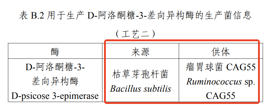 同公告は付録Bにおいて、D-プシコースの生産に使用される生産菌及び酵素製剤の生産菌について制限を設けています。方法2(酵素転換法)を例にとると、公告は「使用認可されたD-プシコース-3-エピメラーゼ」を使用することが求められるのみならず、下表の通り、当該酵素製剤の生産菌の由来や供与株情報についても公告に準拠しなければなりません。つまり、D-プシコース生産企業は、承認済みの酵素製剤を使用し、かつその生産菌の由来及び供与株が公告の記載と一致している場合に限り、直接生産が認められます。それ以外の場合は、D-プシコースを製造する際、改めて新食品原料としての申請が必要となります。