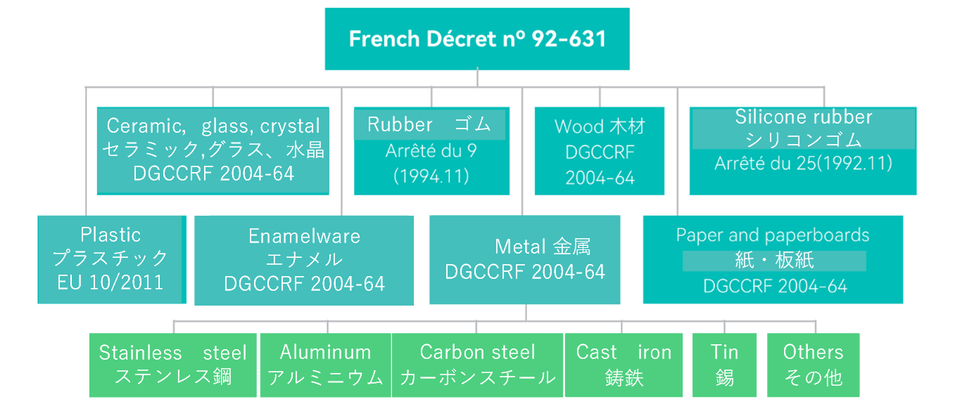 • DGCCRF 2004-64: セラミックス、ガラス、クリスタル、エナメル、金属、木材を対象とします。