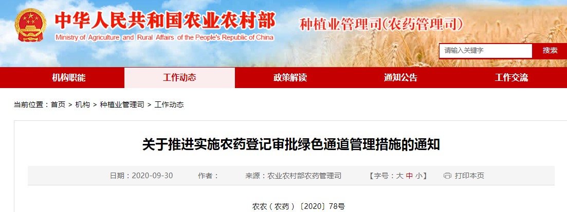 2020年9月30日、農業農村部農薬管理司は、国務院の「放管服(行政簡素化・規制緩和・サービス改善)」改革方針を徹底するため、農薬登録審査のグリーンチャンネル(優先審査)管理措置の推進に関する通知を発表した。製品の効率性と安全性を確保することを前提に、生物農薬、高毒性農薬代替製品、マイナー作物用農薬の登録審査プロセスを簡易化させ、農薬の高品質化と環境に優しい発展を促進する