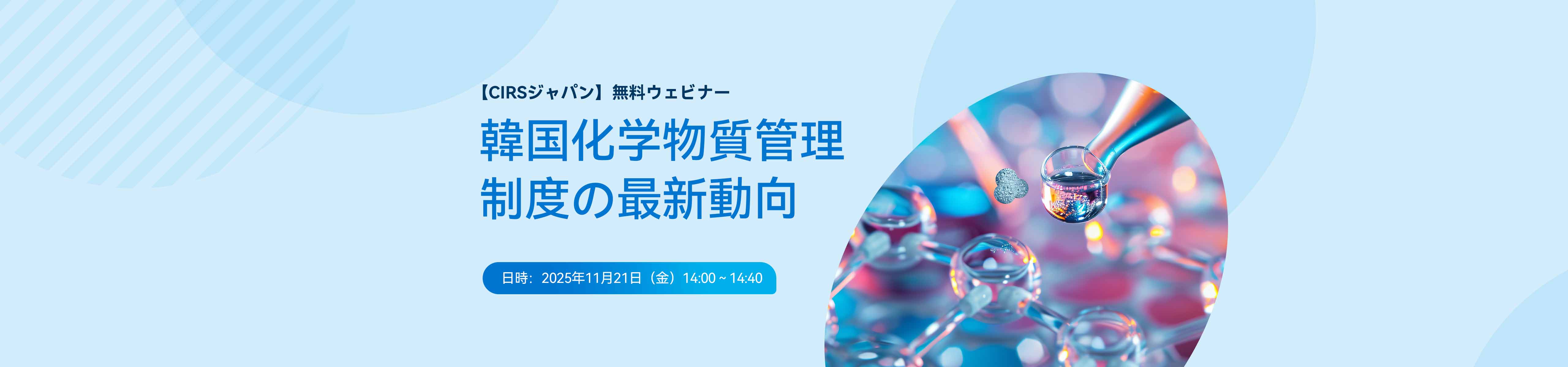2025年11月21日(金)14:00~14:40、韓国化学物質管理制度の最新動向に関する無料ウェビナーを開催いたします。本セミナーでは、2025年11月6日~11月7日韓国で開催された韓国化学物質管理制度の最新政策に関するセミナーで紹介された内容のエセンスを分かりやすく解説いたします。韓国化学物質管理制度(K-REACH、化管法、K-BPR)にご関心のある方は、ぜひご参加ください。