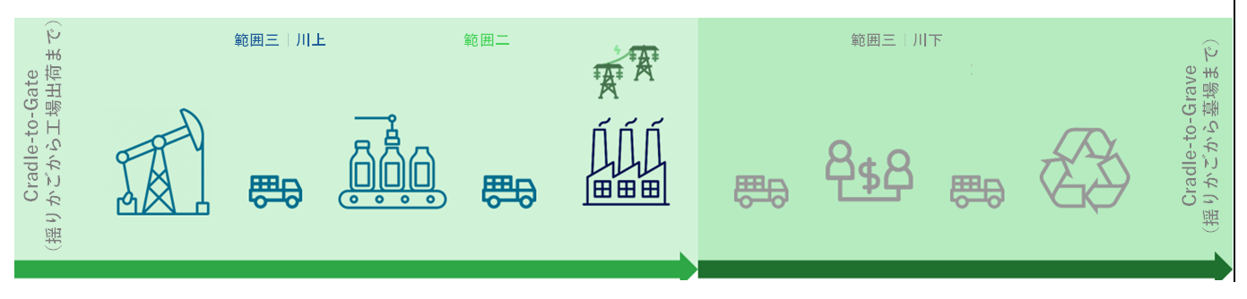 • 「Cradle-to-Gate(揺りかごから工場出荷まで)」: 資源の採掘、加工、製造から製品が製造され工場を出荷するまでに発生する炭素排出量を指します。