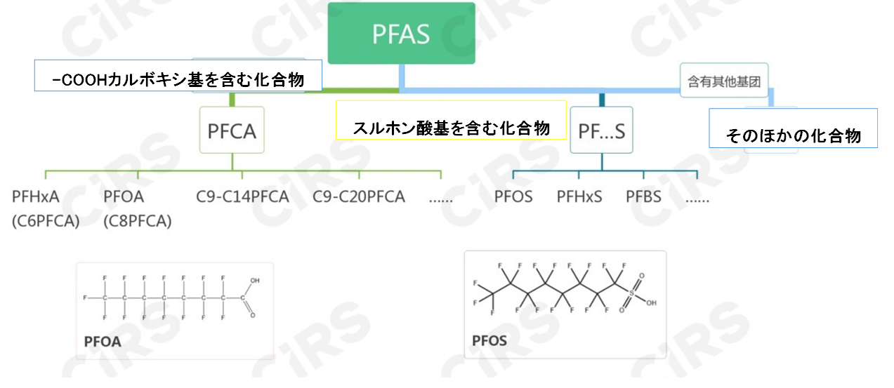 PFAS(ペルフルオロアルキル化合物およびポリフルオロアルキル化合物)は、数千もの個別の物質からなる大規模な合成化学物質群です。各物質は、少なくとも1つのペルフルオロ化メチル (CF3−) またはメチレン (-CF2−) 炭素原子(これらの特定の炭素原子にはH/Cl/Br/I原子が付着していない)を含んでいます。その中でも、PFOA(ペルフルオロオクタン酸)とPFOS(ペルフルオロオクタンスルホン酸)は、それぞれカルボン酸類とスルホン酸類のPFASを代表する2種類の物質です。