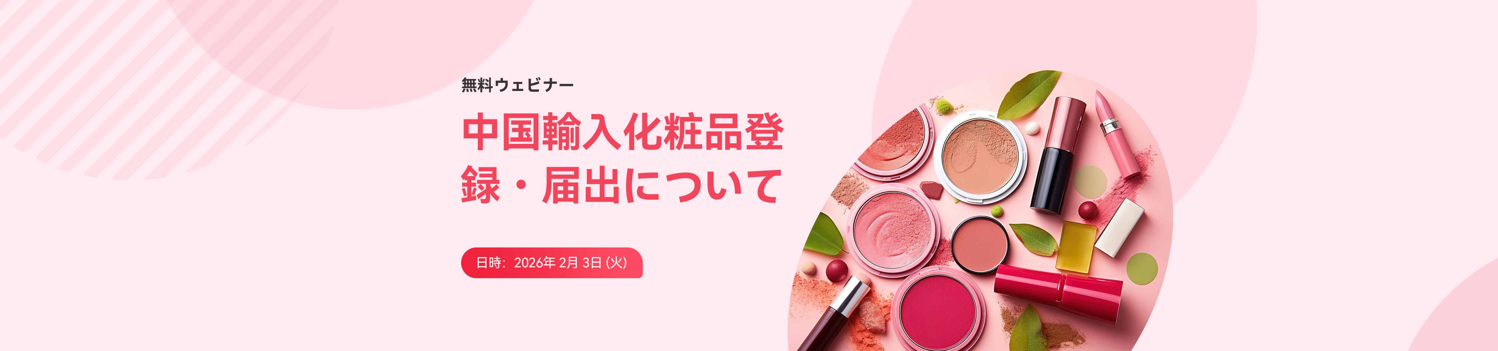 2026年2月3日(火)14:00~14:40、中国輸入化粧品登録・届出に関する無料ウェビナーを開催いたします。本セミナーでは、2022年1月1日より施行された「化粧品安全評価技術導則(2021年版)」をもとに、中国における輸入化粧品登録・届出制度の概要をご説明いたします。特に2025年5月1日より提出必須になった「化粧品安全評価報告書(完全版)」についてポイントを押さえながら分かりやすく解説いたします。中国化粧品市場への新規参入にご検討中の方や、すでに中国市場へ進出しているものの課題をお持ちの方は、ぜひこの機会にご参加ください。