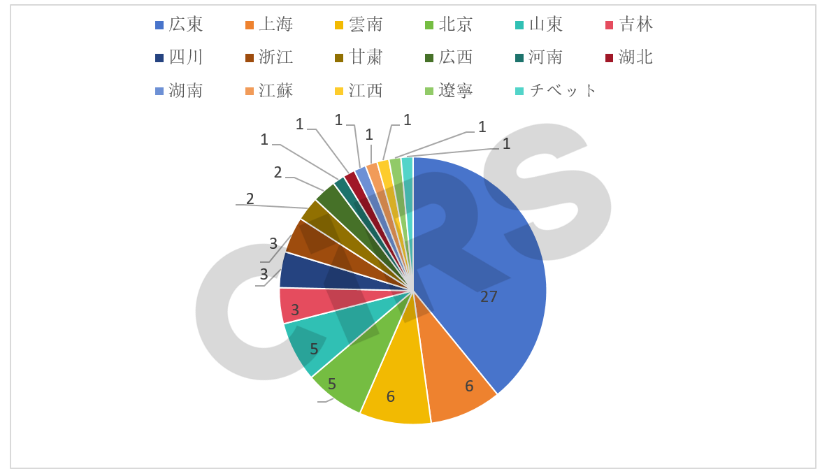 新規原料備案データの分析によると、69件の新規原料は中国国内企業によって届出され、54社が関与しており、これらは17の省・地域(広東、上海、雲南、北京、山東、吉林、四川、浙江、甘粛、広西、河南、湖北、湖南、江蘇、江西、遼寧、チベット)に分布しています。図1に示すように、中国国内届出者が所在する省の中で、最も多くの新規原料届出番号を取得したのは広東省で、合計27件でした。これは2025年上半期における中国国内届出企業の新規原料届出総数における約39.1%を占めています。